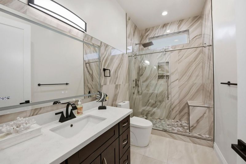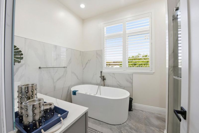 - Double Sinks, Dual Flush Toilet, Full on Ground Floor, Half on Ground Floor, Marble, Primary - Oversized Tub, Primary - Stall Shower(s), Shower and Tub, Tile, Tub in Primary Bedroom
