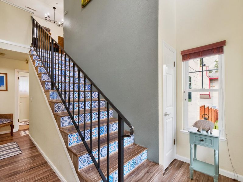 The South African-inspired landscape greets you as you arrive to this beautifully appointed home which offers a perfect blend of comfort, style, and unique outdoor charm. Inside this 3 bed 2 bath home is a thoughtful mix of laminate and hardwood flooring, with plush carpeting in the bedrooms for added warmth. Colorful tiled stairs take you up to the living area. The kitchen is both elegant and functional, featuring a marble countertop, stainless steel sink, appliances, spacious pantry, and an open floor plan that flows seamlessly into the living area ideal for both everyday living and entertaining. The living room boasts high ceilings and a cozy fireplace, creating a bright yet inviting atmosphere. Double doors from both kitchen and living room open onto a generous deck, effortlessly extending your living space outdoors. Step outside to experience a truly special setting. A heated swim spa with high-flow jets offers the perfect setup for relaxation or lap swimming. The property is also home to an impressive collection of 55 olive trees along with a variety of fruit trees, offering both beauty and abundance. Additional highlights; 2 car garage, plus Level 2 EV charger, combining modern convenience with sustainable living. Easy access to freeway, beaches, restaurants and schools!