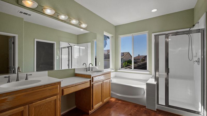 - Double Sinks, Shower Stall(s), Tub, Walk-In Closet, Window